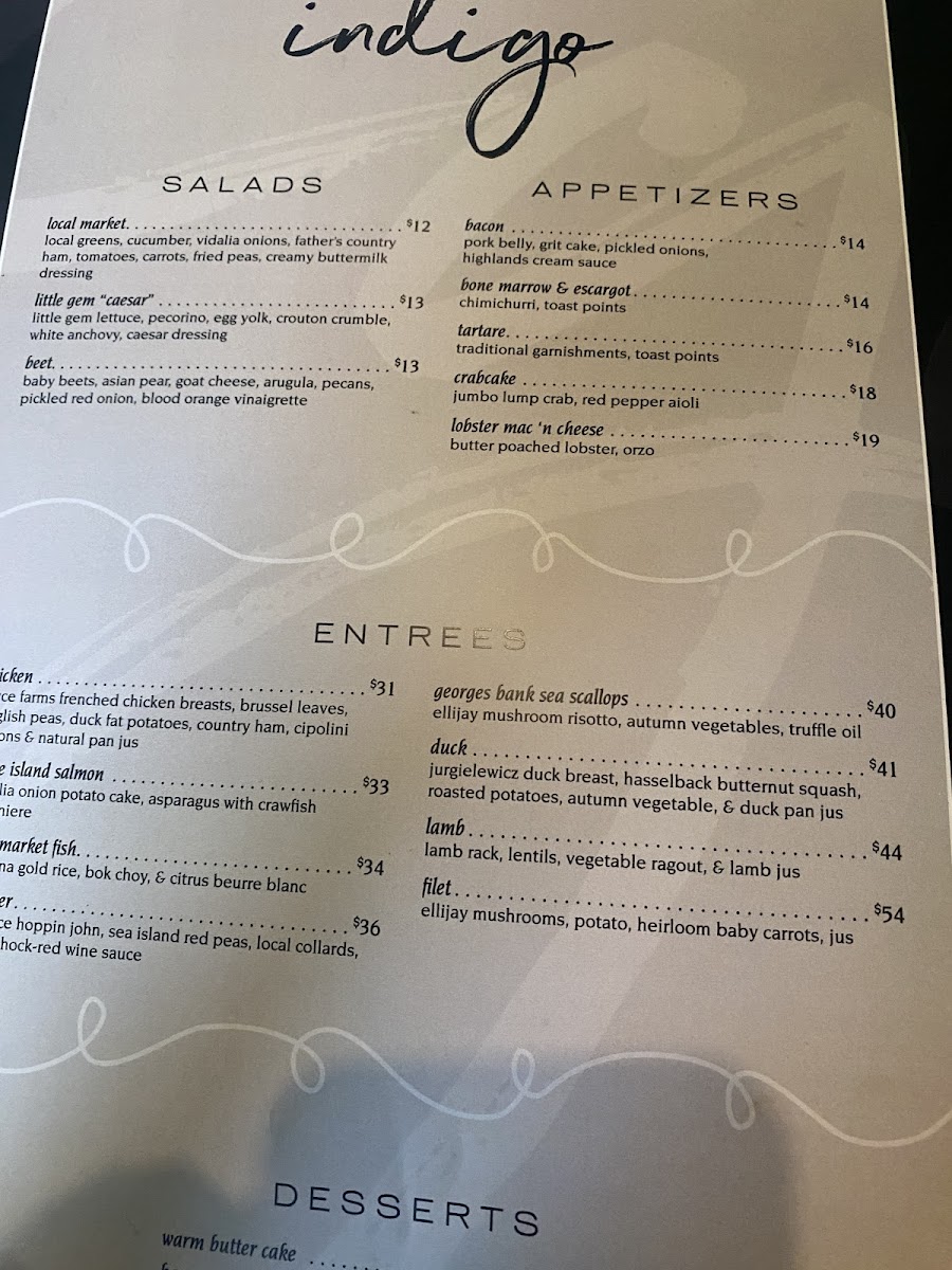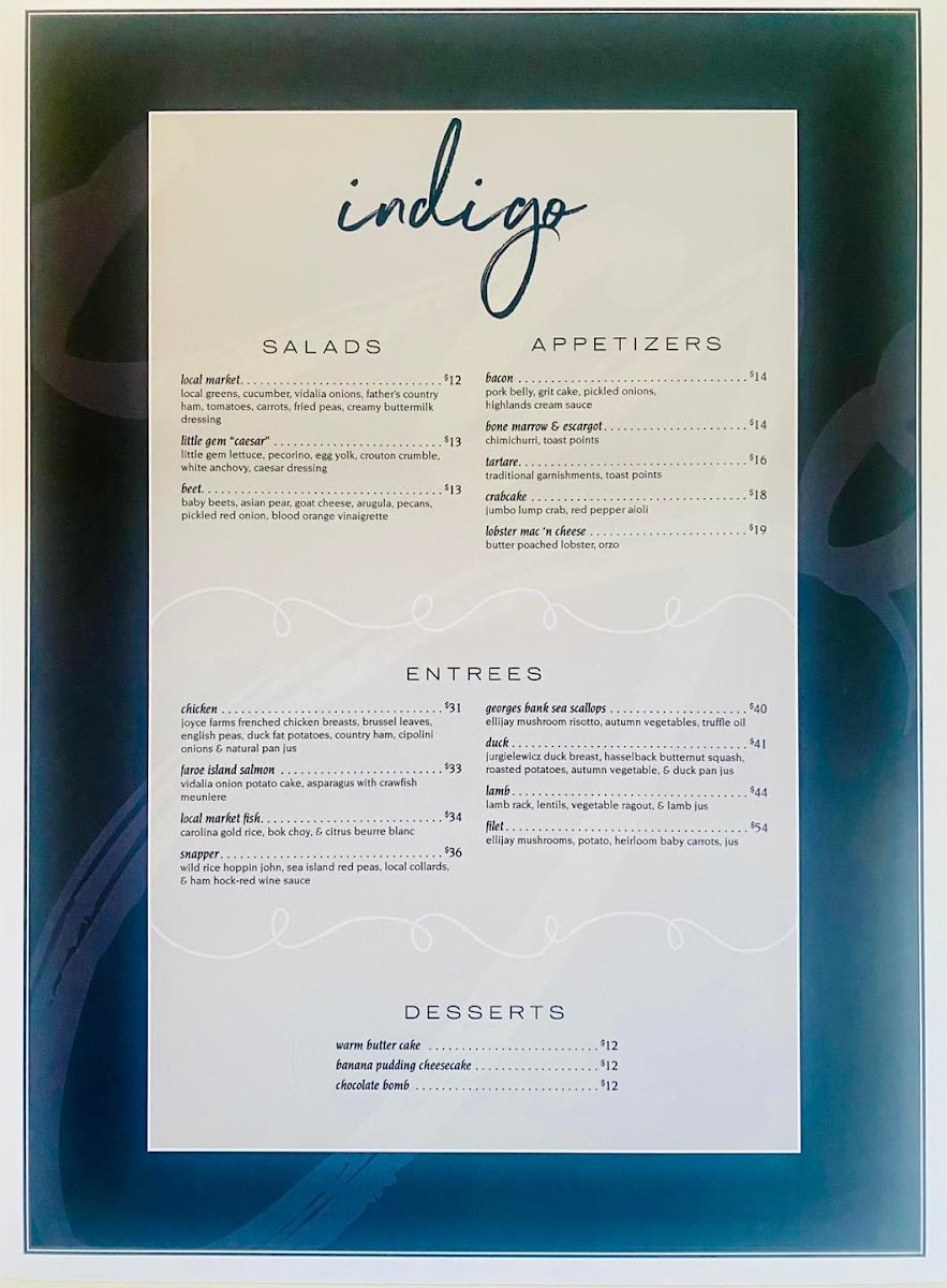 At Indigo Menu, located at 20 S 2nd St, Fernandina Beach, FL, you’ll find a delightful mix of flavors that reflect the charm of the coastal town. Whether you’re in the mood for fresh seafood, a perfectly cooked steak, or something lighter like a crisp salad, there’s something here to satisfy every palate. The menu is carefully crafted to highlight seasonal ingredients, ensuring each dish is as fresh as it is flavorful. With options for both the adventurous and the comfort-food lover, you can expect dishes that are both creative and comforting. From indulgent appetizers to indulgent desserts, the offerings at Indigo are designed to take your taste buds on a journey, all while showcasing the warmth and laid-back vibe of Fernandina Beach.